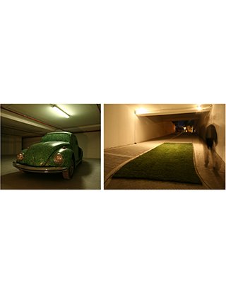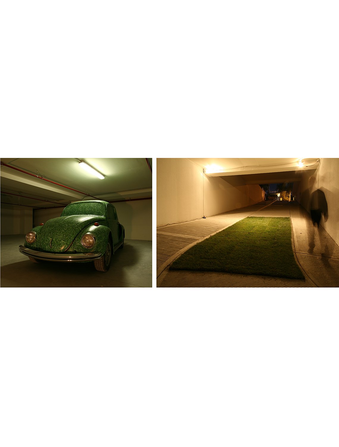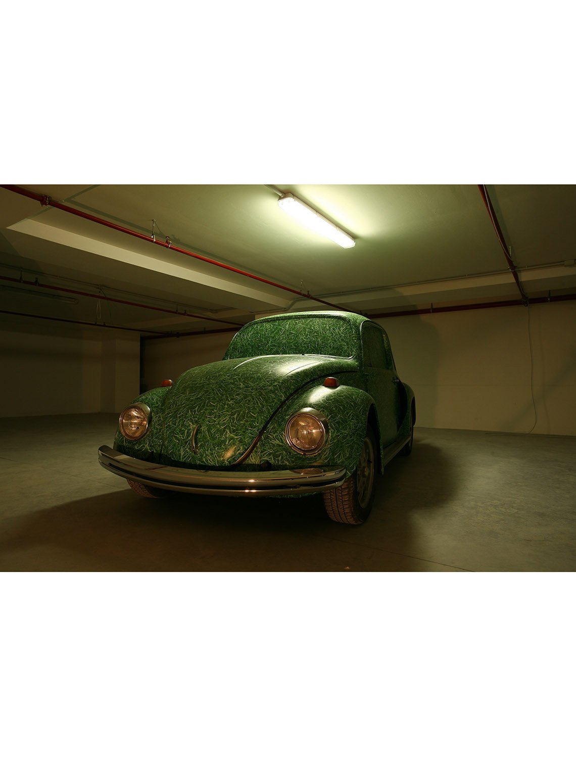 In the parking lot, the skeleton of a Beetle Volkswagen clothed in grass – dating with my childhood and coming from a green but car-less time to a car-dominated but greenless time – and the other element of some square meters of grass, laid upon the concrete, both release a feeling of nostalgia and embodies a disturbance emerging from the victory of economic development over the environment.