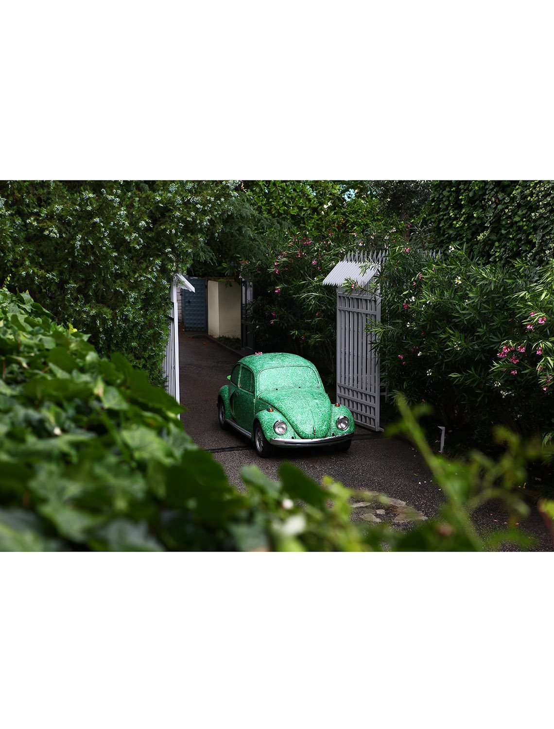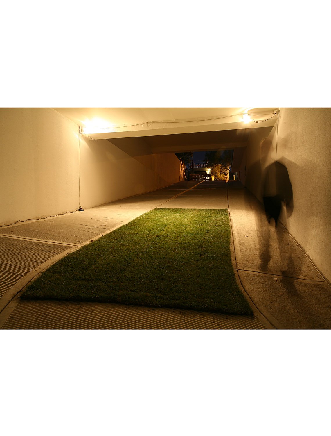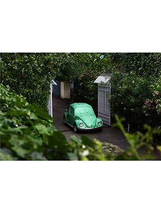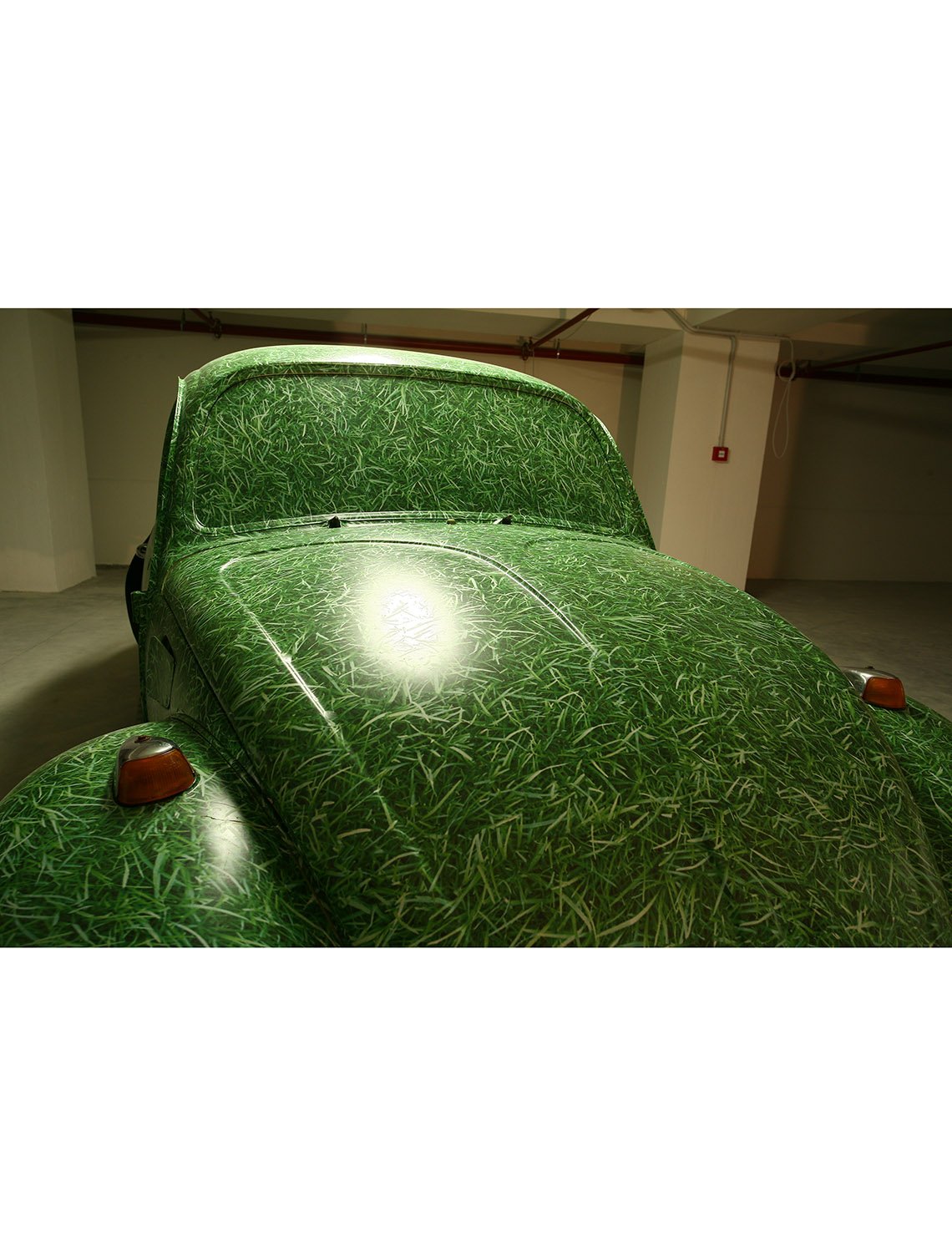 In the parking lot, the skeleton of a Beetle Volkswagen clothed in grass – dating with my childhood and coming from a green but car-less time to a car-dominated but greenless time – and the other element of some square meters of grass, laid upon the concrete, both release a feeling of nostalgia and embodies a disturbance emerging from the victory of economic development over the environment.